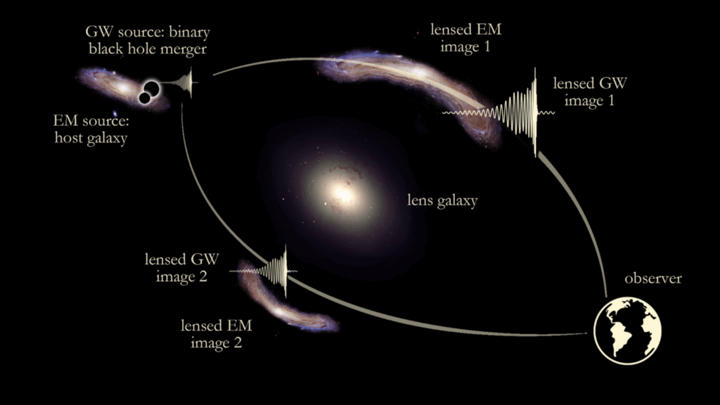 Figure 1: Schematic illustrating the process of strong gravitational lensing, where the original emitted signal passes close to a lensing object and multiple “copies” of that signal are produced, each with its own path and different magnification. These multiple copies then arrive at the observer on Earth at different times, as distinct signals. The schematic illustrates the effect of strong lensing on a gravitational-wave (GW) source, overlaid on depictions of the effect of strong lensing on light, i.e. an electromagnetic (EM) source: distorted images of the GW source’s host galaxy as they would be observed by telescopes. [Image credit: Laura Uronen, CUHK.]
