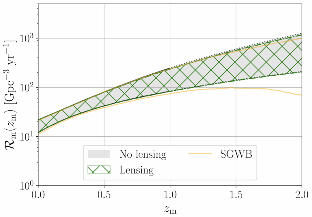 After examination of the almost three and a half thousand pairs of signals that came from combinations of the gravitational-wave sources detected in O4a by our high-speed analyses, only a few tens of these pairs were passed for more intensive study. However, none of these displayed any significant support for lensing and so were discarded. For the subthreshold searches there were also no stand-out candidates. In addition, our Type II strong lensing analysis did not find any significant support for the lensing hypothesis amongst the new events. These results were still useful, however: we used this non-detection of strong lensing to infer constraints on how often binary black holes merge at high redshift, as shown in Figure 2.