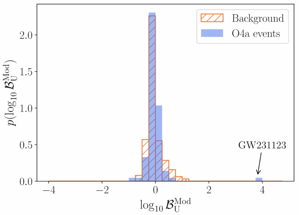 Figure 3: (Figure 6 of our paper.) The distribution of Bayes factors—which tell us how preferred one model is over another—comparing lensed and unlensed models for the O4a events considered in our study. Shown in blue is a histogram of the (base ten) logarithm of the Bayes factor, comparing a lensed model (where the lens is an isolated point mass) with an unlensed model, for each of our events. Also shown in orange is a histogram of log Bayes factor values for a simulated distribution of just over 250 unlensed events. The majority of the O4a events lie within the simulated distribution. However, GW231123 lies significantly outside of this distribution.