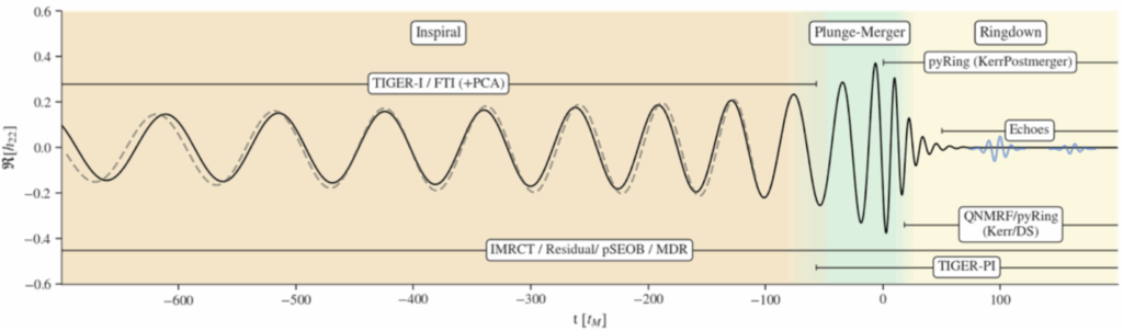 Figure 1: Gravitational wave signal from a binary black hole merger. The figure highlights the inspiral, plunge-merger and ringdown regions of the signal that are used for different tests of General Relativity. The name of the tests and the time interval over which each test is applied are also indicated. A hypothetical distorted signal, deviating from the General Relativity prediction, is shown as a dashed line. Possible “echoes,” expected if the merger remnant were not a black hole, are illustrated in blue.