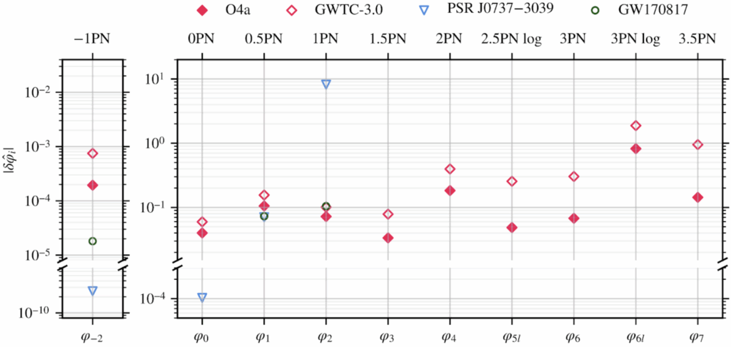 Figure 2: Constraints on the so-called post-Newtonian coefficients, which govern the phase of the gravitational-wave signal, are shown. These coefficients capture possible deviations from General Relativity at different stages of the binary evolution (from wide separations on the left to the late inspiral just before merger on the right). The current analysis yields significantly tighter bounds (lower values) on such deviations compared to earlier results.