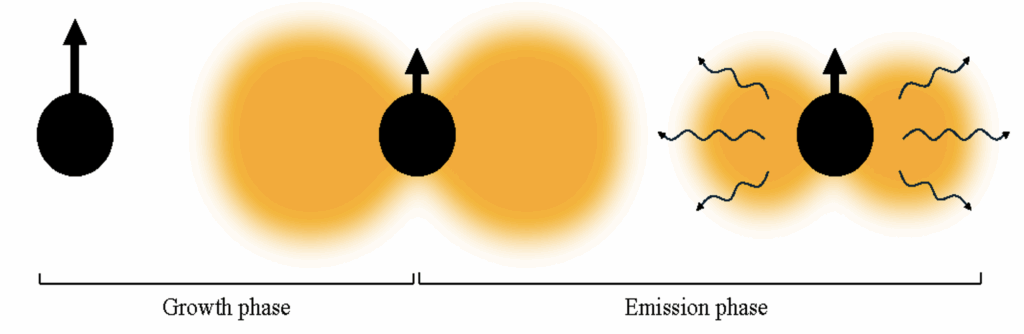 Figure 1: Schematic representation of the superradiant growth and depletion of a boson cloud around a rotating black hole. The schematic divides this process into two distinct phases: the growth phase, during which the black hole loses mass-energy to the growing boson cloud, and the much longer GW emission phase, during which the boson cloud loses energy, radiating gravitationally.