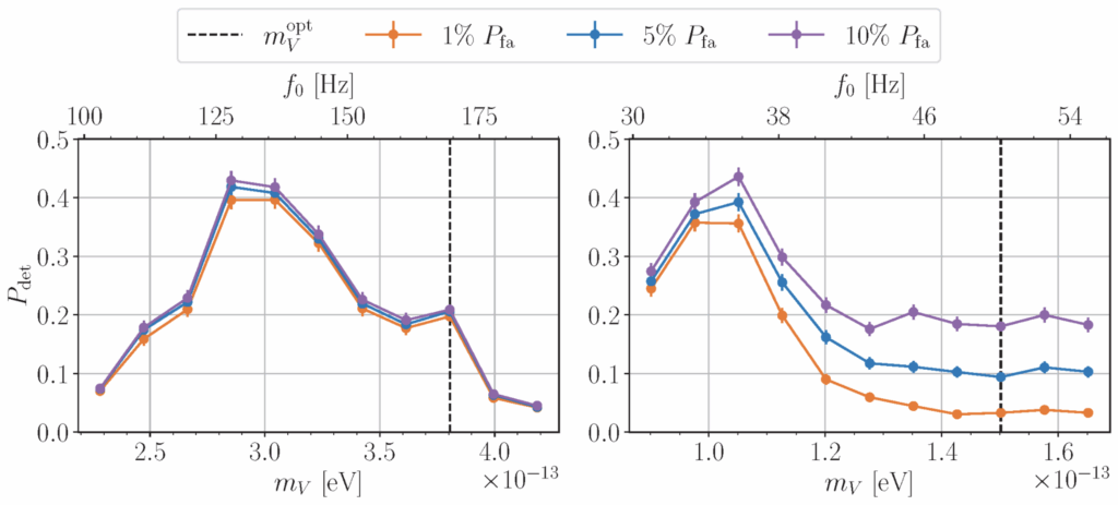 Figure 2: The estimated confidence (Pdet) with which we can disfavor the existence of the vector boson mass (bottom axis) given that the searches targeting the remnant black holes from GW230814 (left panel) and GW231123 (right panel) did not detect anything. The top axis shows the corresponding frequency at which each boson mass would emit GWs. To interpret these results, let us consider the orange curve which represents a 1% false alarm probability (Pfa); then, we can say that the boson mass range with Pdet > 0.3 is disfavored with 30% confidence for a 1% Pfa. Although this is not a confident exclusion, future observations will allow us to test these boson mass ranges with higher confidence.