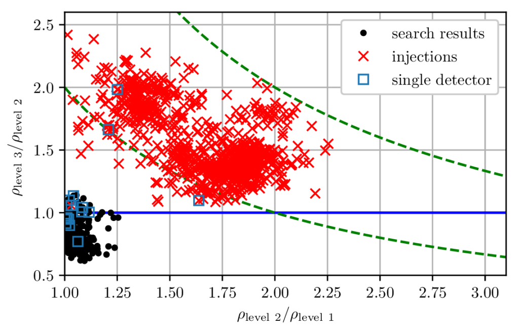 Figure 2: This figure shows the results of follow-up analyses of potential signals from the search. The x-axis shows the ratio of signal-to-noise ratios (SNRs) before and after a quadrupling of the coherence time in the cross-correlation, which should theoretically double the SNR. The y-axis shows the ratio of SNRs before and after a second quadrupling. (The green dashed lines show constant values of x times y, i.e., the ratio of SNRs before and after the two quadruplings taken together.) The red crosses show simulated injected signals, whose SNRs increase with each increase in coherence time. In comparison, the SNRs of the search candidates (black dot) do not follow the expected behavior of a true signal.
